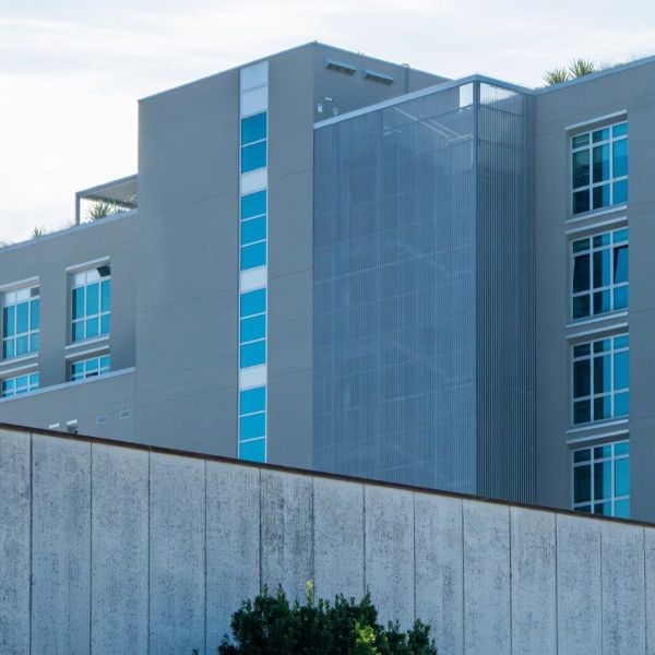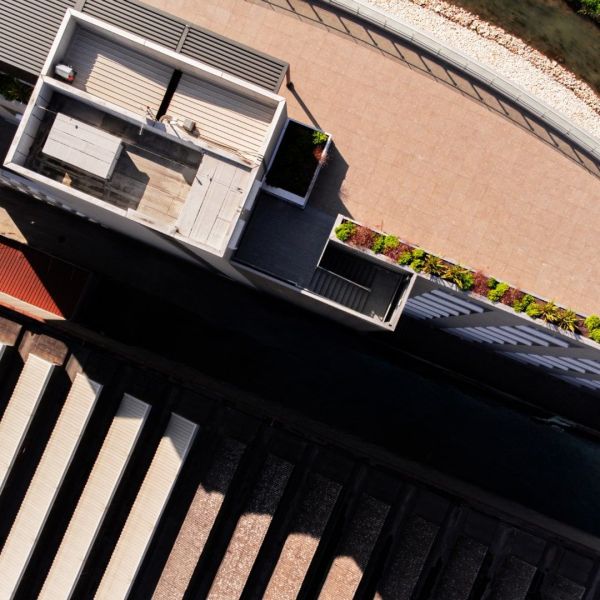 L’uso dell’acciaio zincato assicura resistenza nel tempo e manutenzione ridotta, mentre la finitura microforata favorisce ventilazione naturale e leggerezza visiva, in linea con i criteri di eco-compatibilità dell’intero complesso.