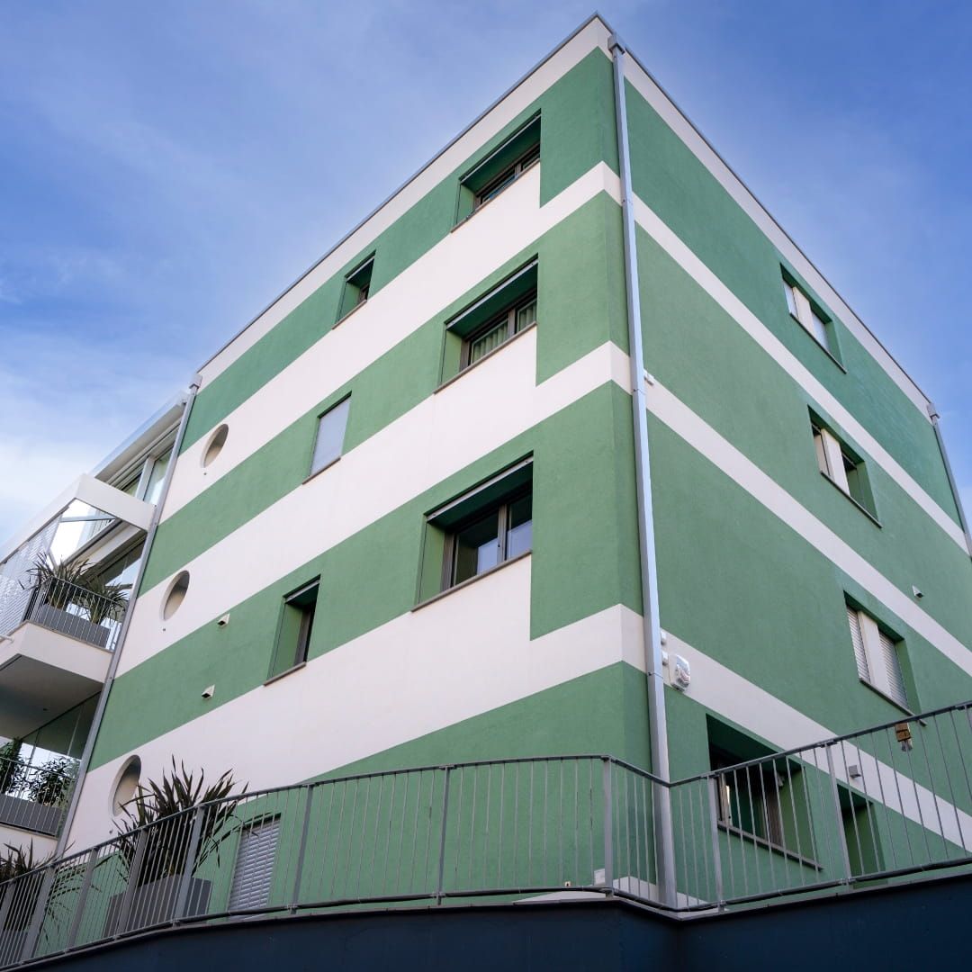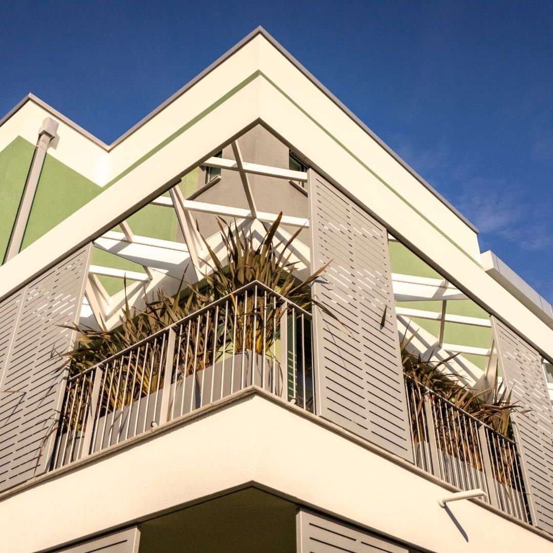 Nel progetto della Palazzina Via Chiminelli, i grandi frangisole orizzontali con motivo a rombi rappresentano un tratto distintivo dell’edificio.